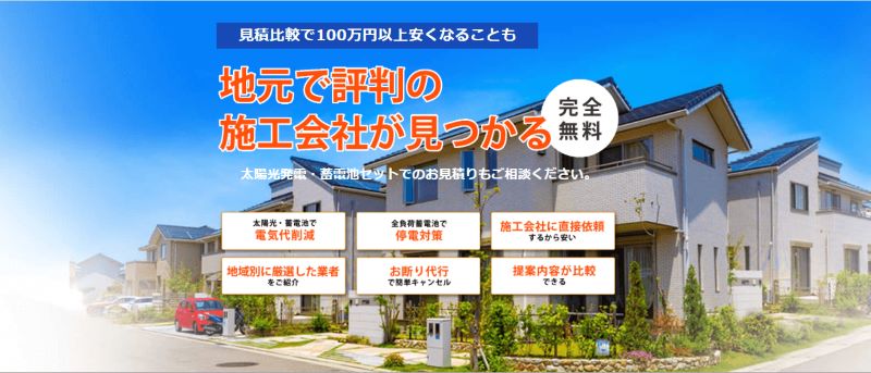 | 特徴 | 自社施工会社だけ紹介 工事完了保証付き 補助金に対応 断り代行サービス | 販売施工会社を紹介 補助金に対応 図面が無くても見積り可能 | 販売施工会社を紹介 補助金に対応 |
