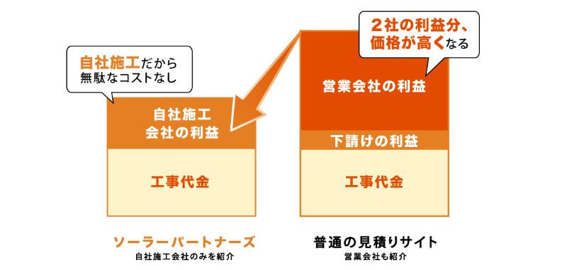 ソーラーパートナーズは自社施工会社だけ紹介してくれるので、価格の安い業者のなかから選べます。