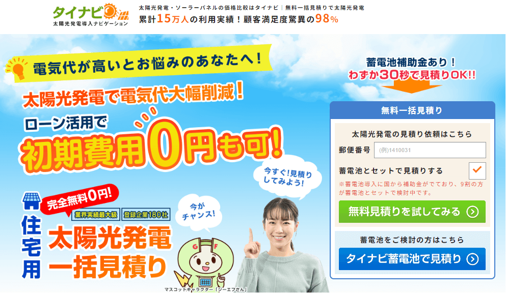 太陽光発電の一括見積りサイトのなかでも人気が高いのが「タイナビ」です。