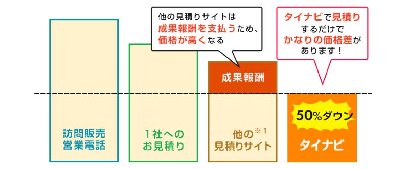 訪問販売業者の見積りと比較して100万円以上安くなった事例もあるので、損したくない人はタイナビから見積り依頼してください。